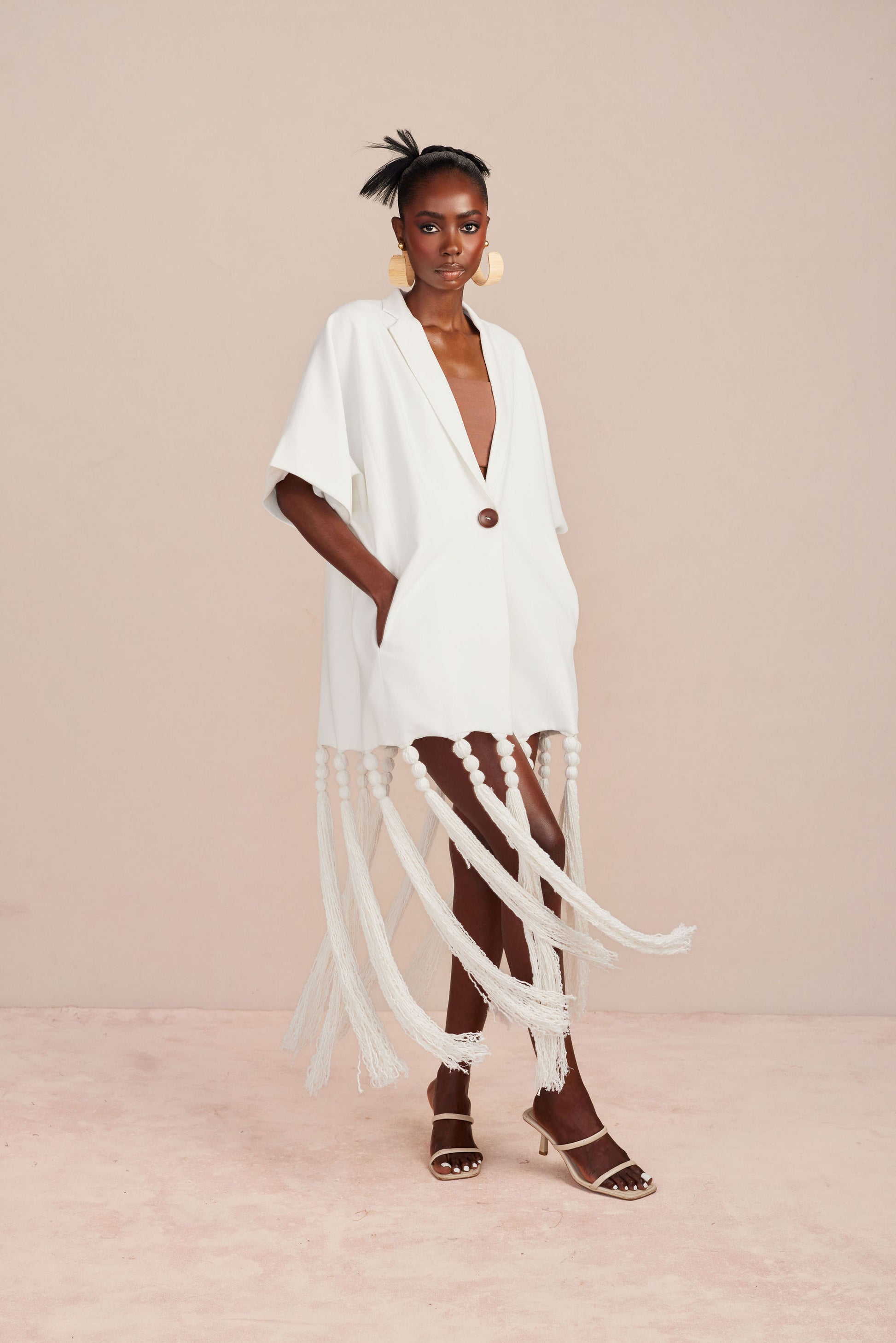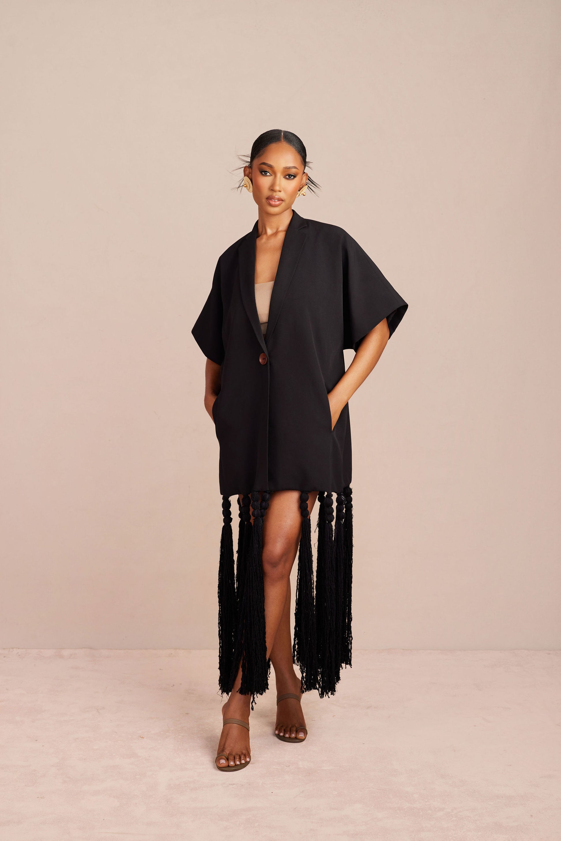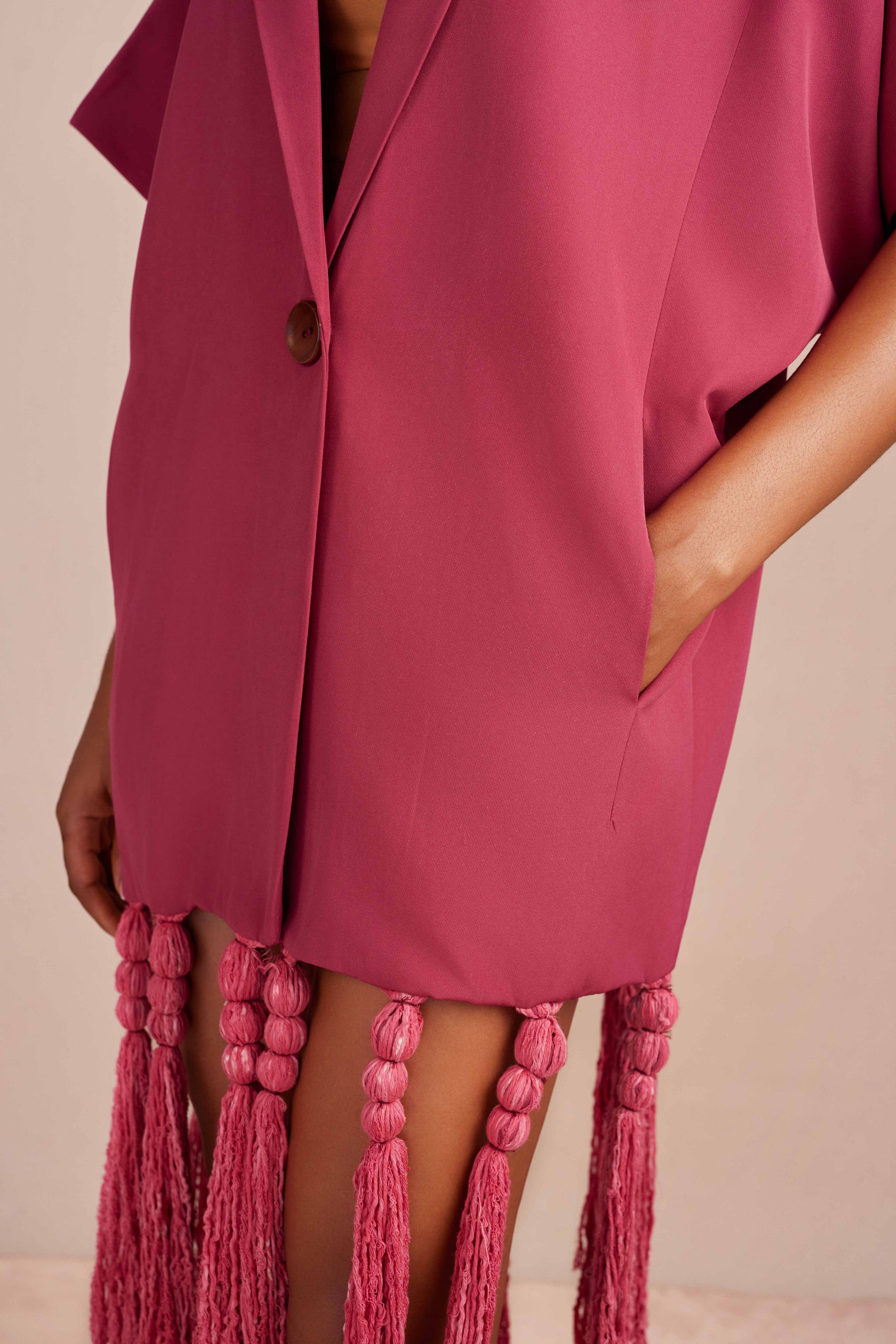 • Fringe and bead detailing around the blazer hem