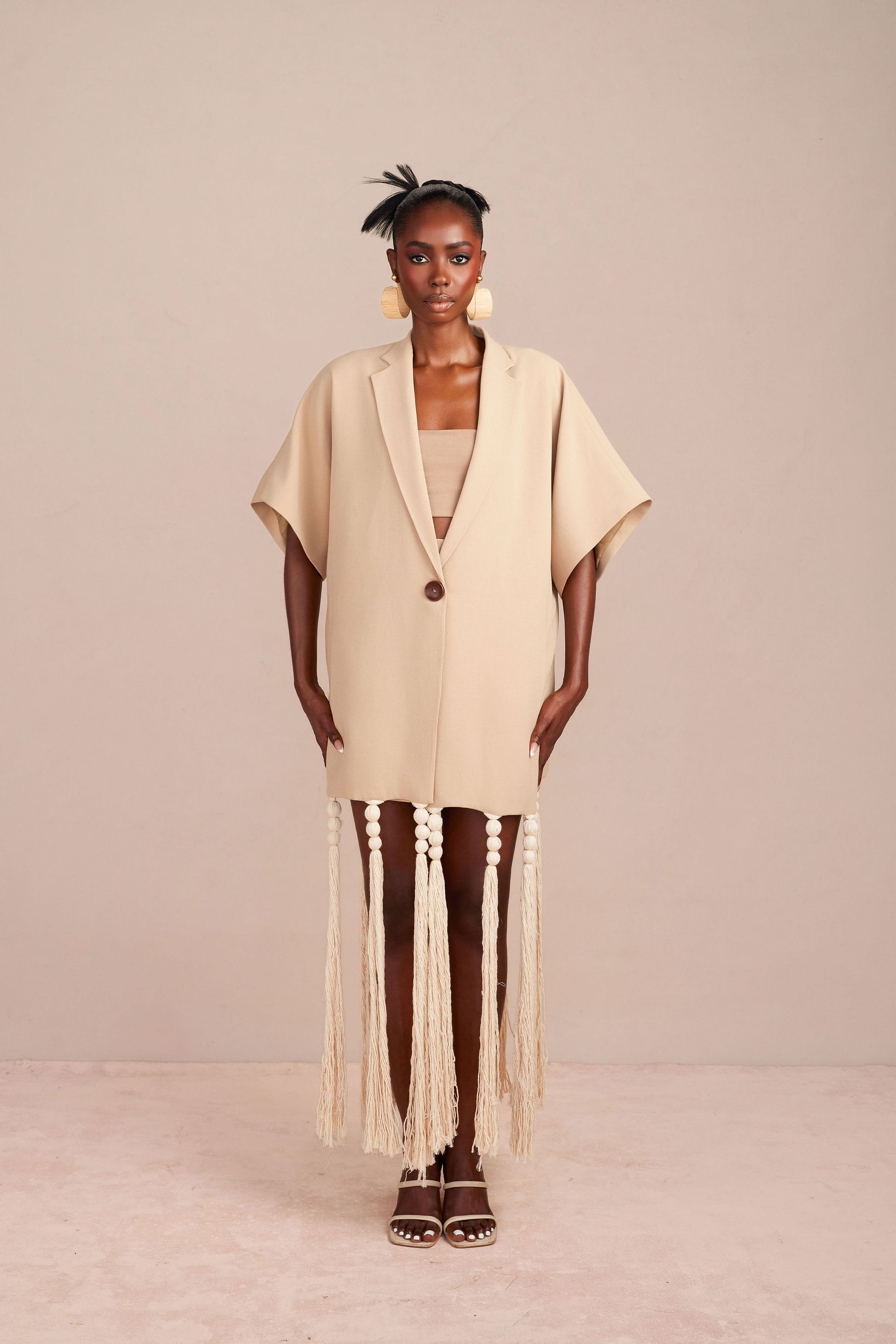 A tailored two-piece set crafted in a soft neutral beige, combining clean structure with refined embellishment. The high-waisted tailored short features subtle front pleats for a flattering, elongated silhouette. Paired with a short-sleeve blazer designed with a button-front closure and finished with fringe and bead detailing around the hem for added texture and movement. The set offers versatile styling, balancing polish with modern ease.
