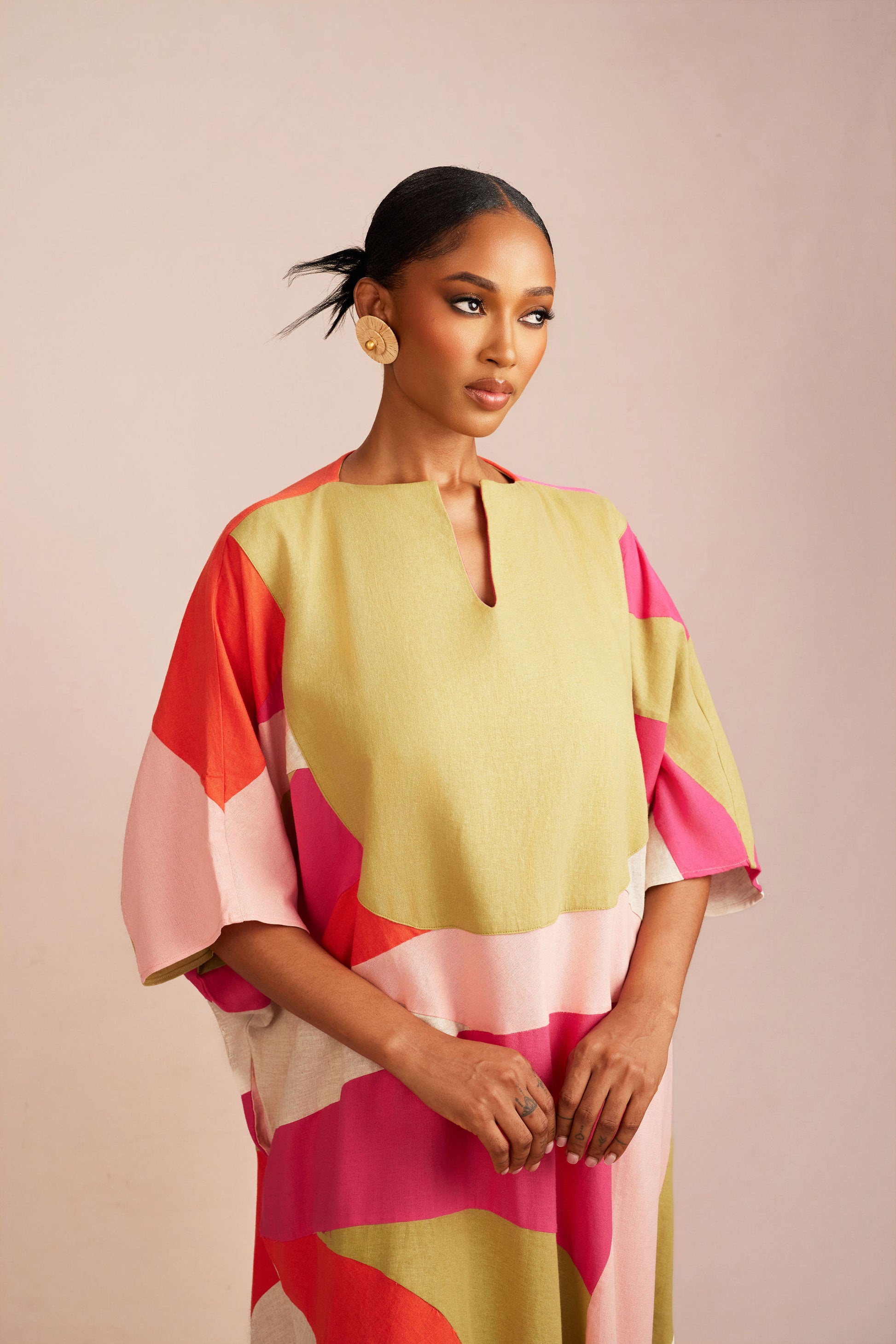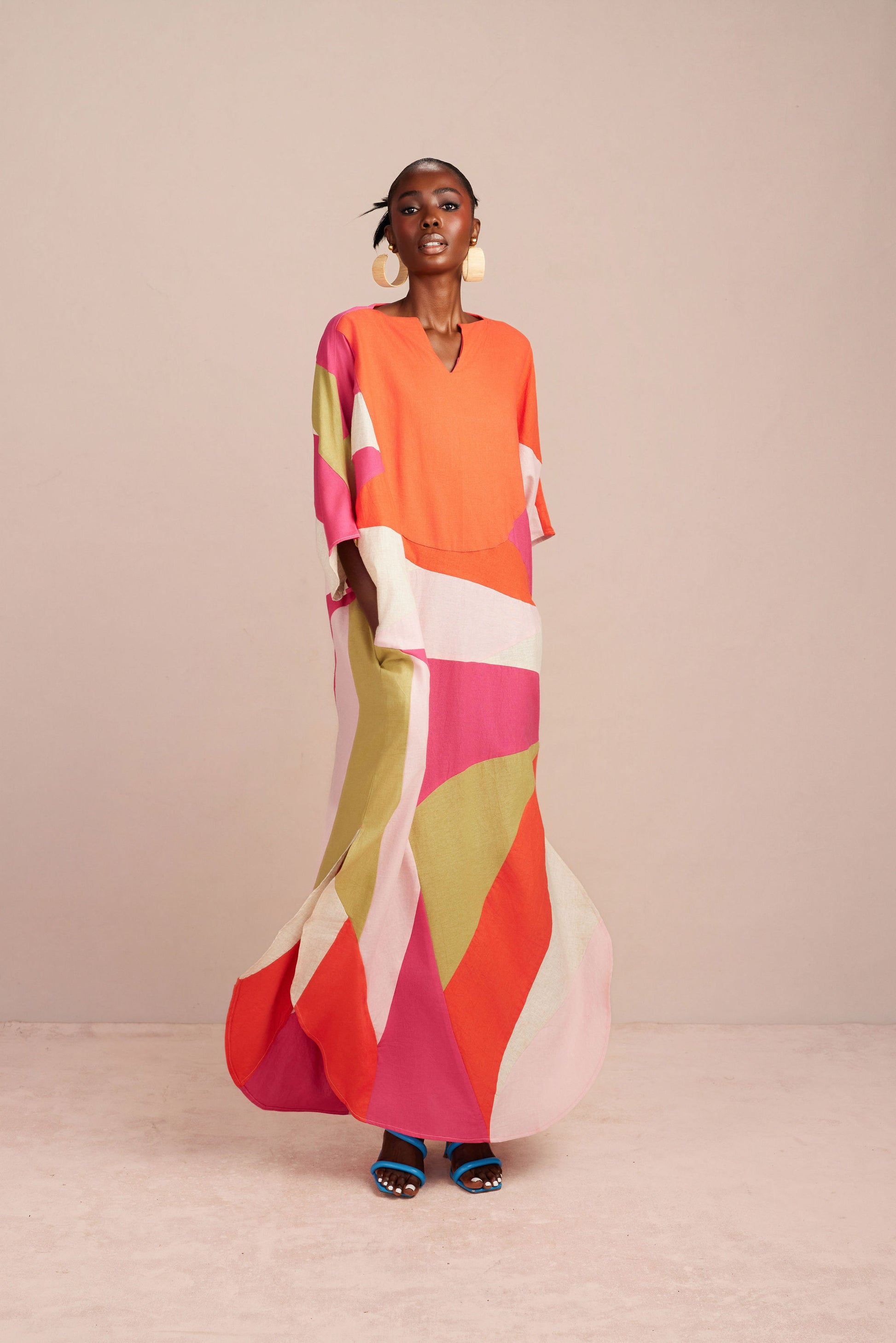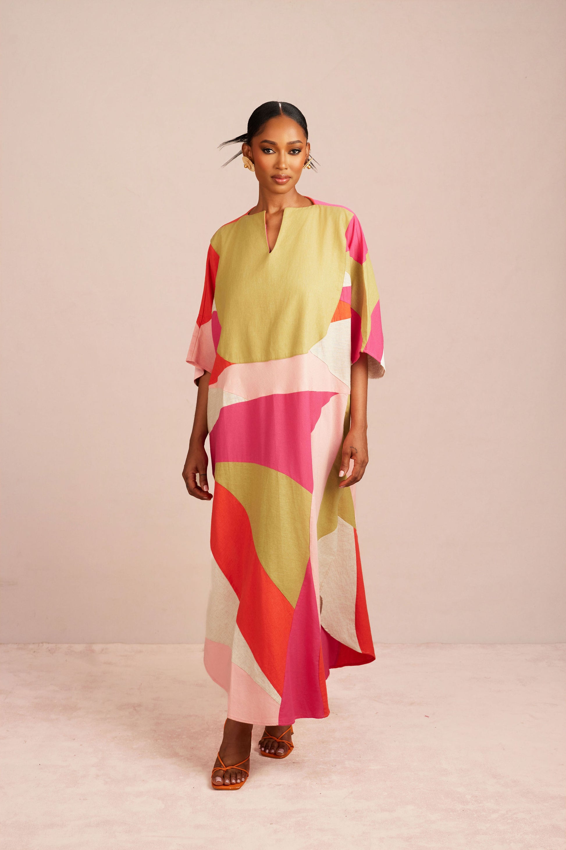 A celebration of color and craftsmanship, this Abaya is much more than a simple maxi dress. Every inch of this vibrant fabric is created by hand-stitching individual patches of linen together, one by one. This painstaking process creates a one-of-a-kind "tapestry" effect that feels as special as it looks.