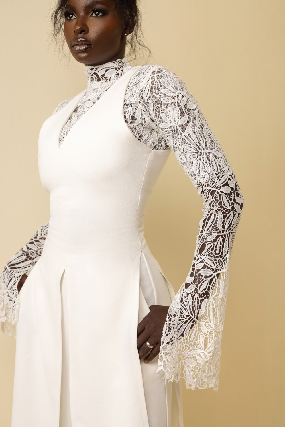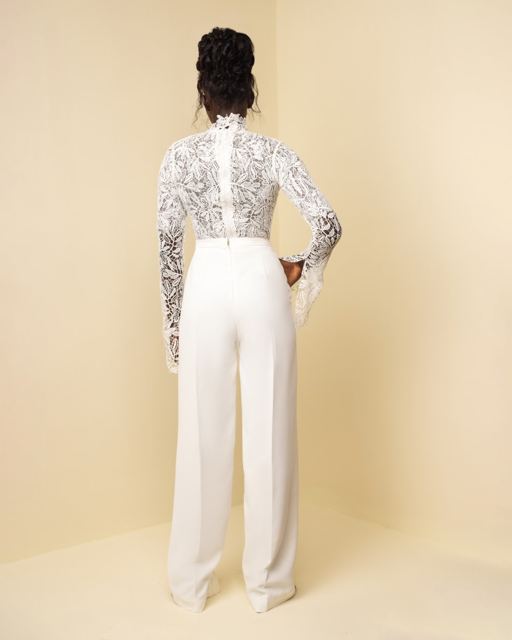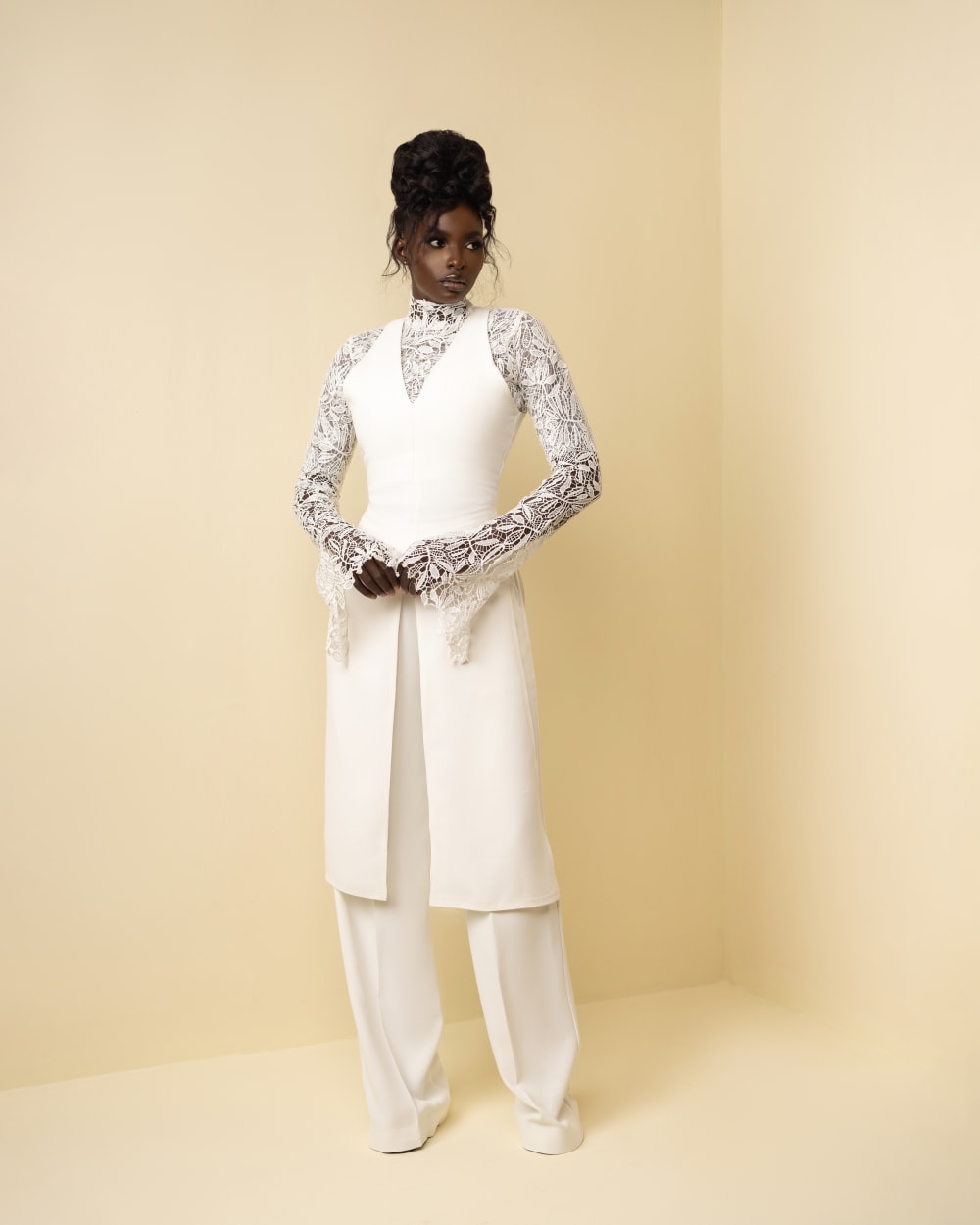 The Seime Set showcases a beautifully layered look, featuring a chord lace blouse lined with delicate chantilly lace. Over it, a knee-length crepe pinafore adds structure, paired with relaxed-fit, high waist crepe pants for a refined yet contemporary aesthetic, ideal for unique and stylish occasions.
