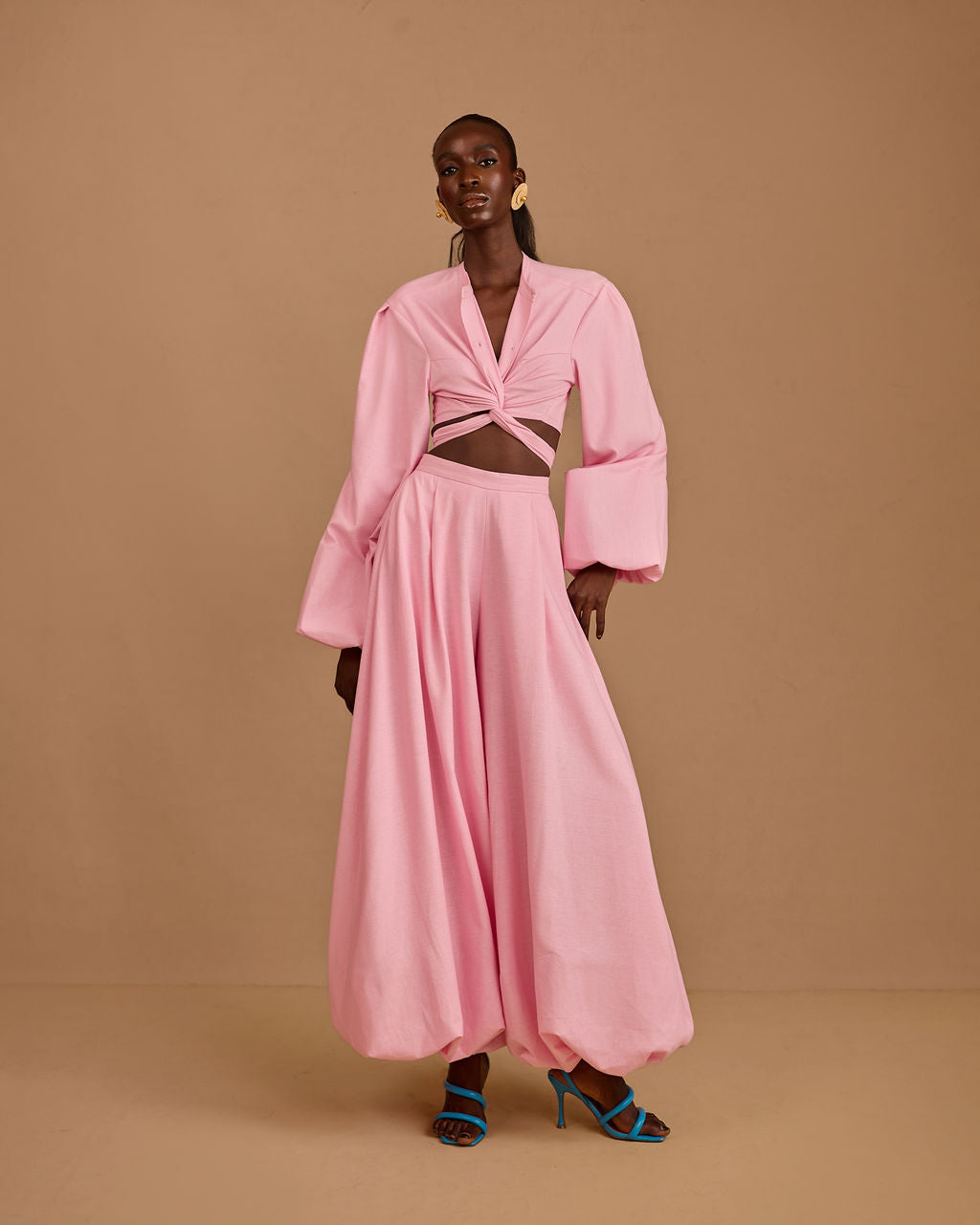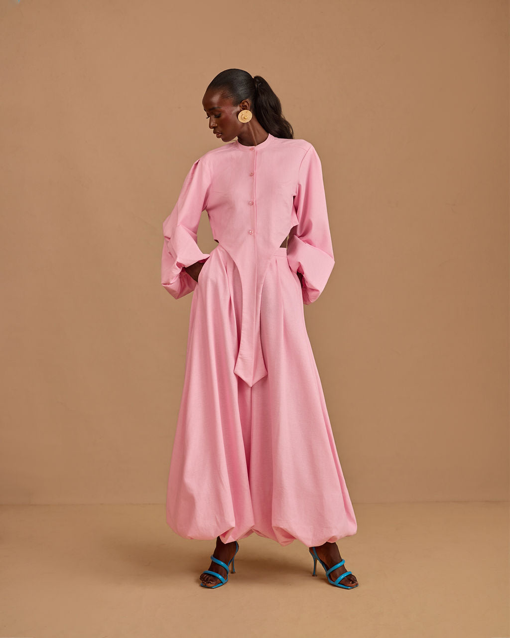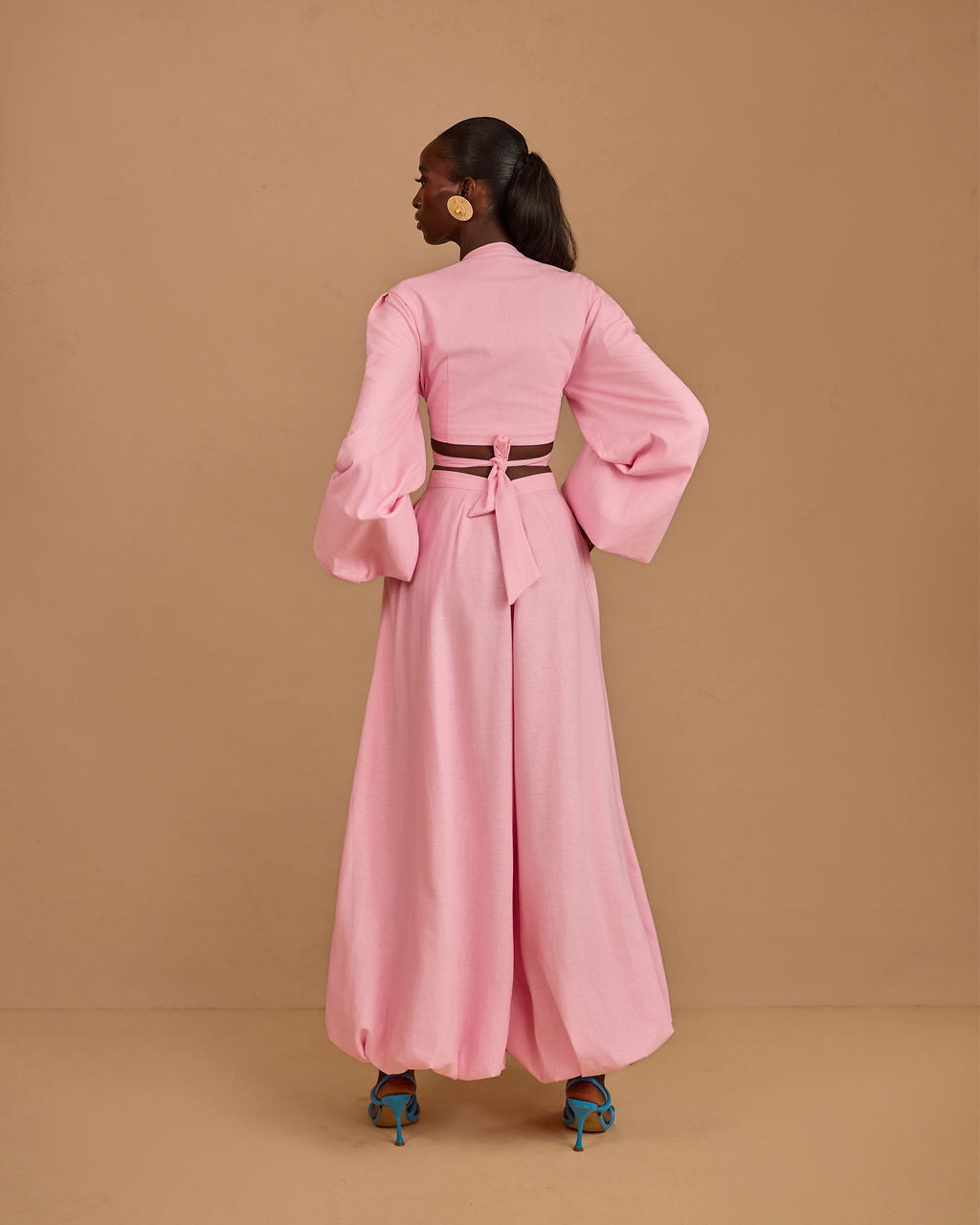 The real secret is in the hem: we’ve lined the bottom of the balloon pants with a discreet layer of hard net. This ensures the dramatic, rounded shape stays perfectly "puffed" and voluminous as you move, never falling flat.