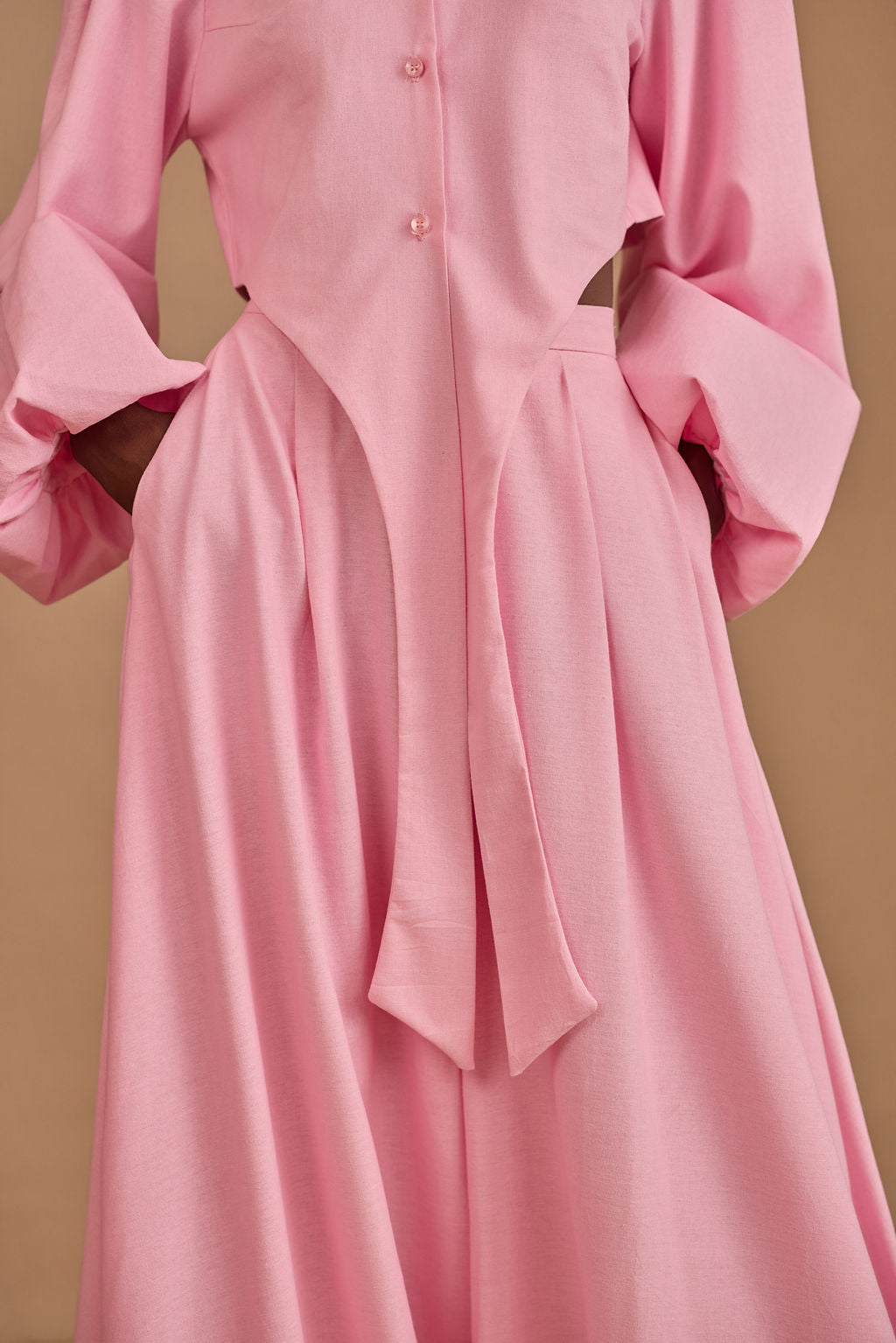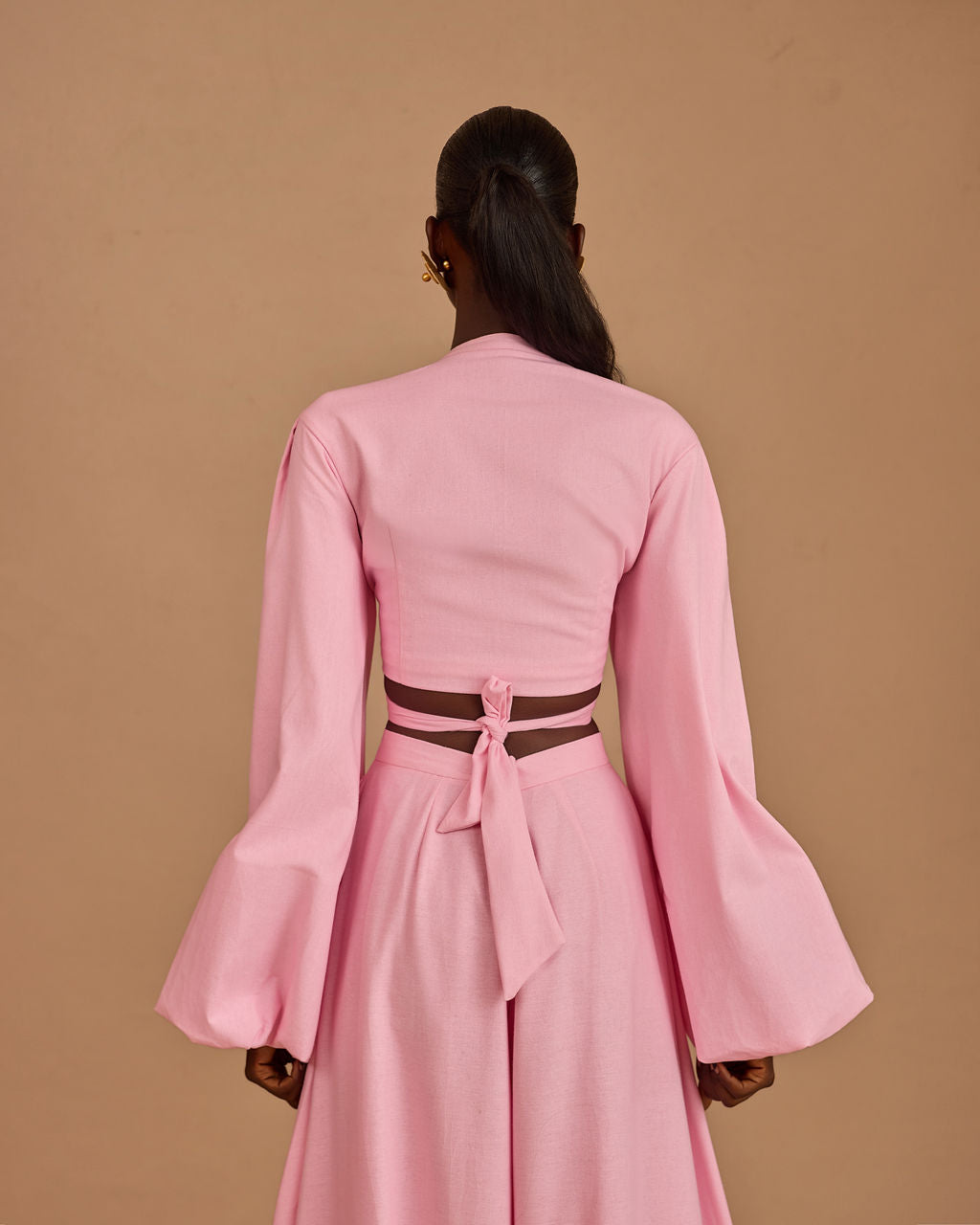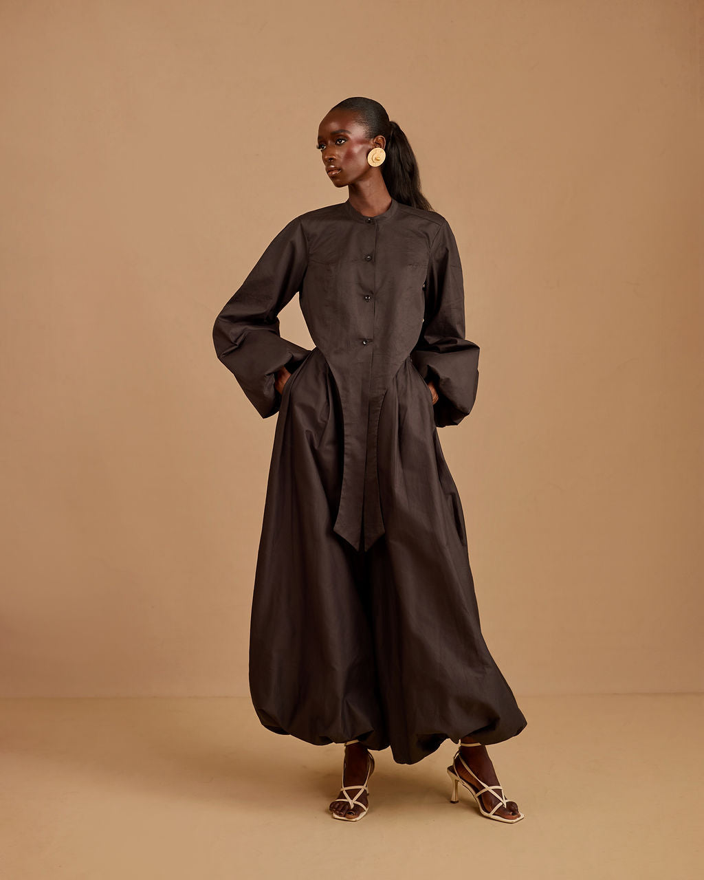 The real secret is in the hem: we’ve lined the bottom of the balloon pants with a discreet layer of hard net. This ensures the dramatic, rounded shape stays perfectly "puffed" and voluminous as you move, never falling flat.