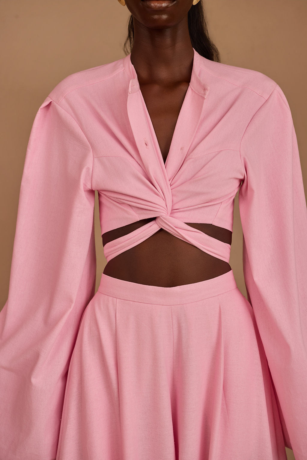 Option 1: The Wrapped Crop Twist and tie the top to show a bit of skin. It creates a beautiful contrast—a cinched, feminine waist paired with the massive volume of the trousers.